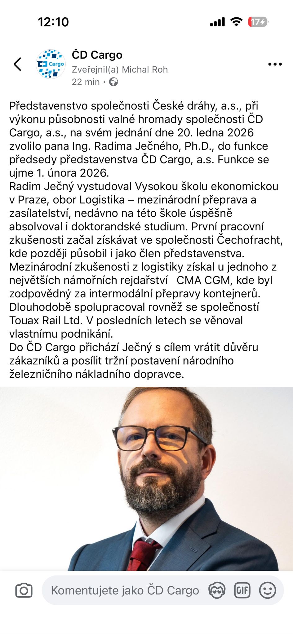 Absolvent naší vedlejší specializace Ing. Radim Ječný, Ph.D. se dne 20.1.2026 stal předsedou představenstva ČD Cargo, a.s. Srdečně gratulujeme, Radime!