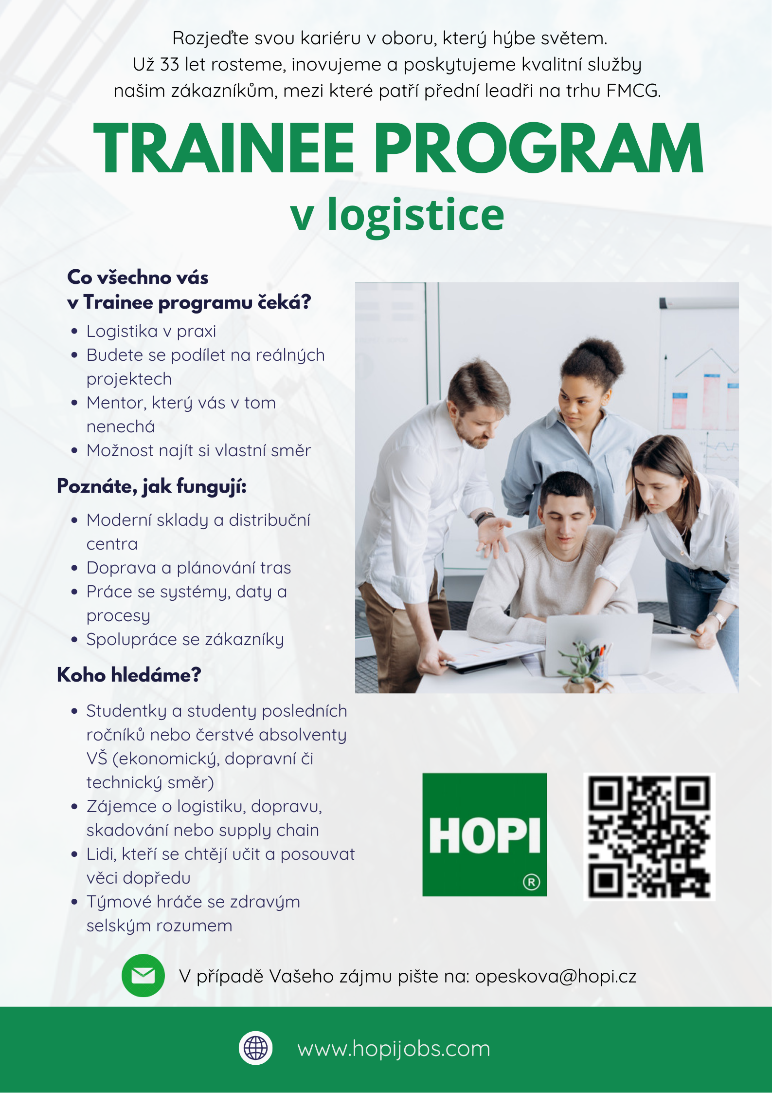 Aktuální stáže a pracovní programy DPD – compliance projekt <říjen 2025> HOPI – placené stáže <říjen 2025> HOPI – marketing divize FOOD <říjen 2025> HOPI – trainee program <únor 2026> P&G – event v Paříži – Finance Leaders of Tomorrow <říjen 2025>